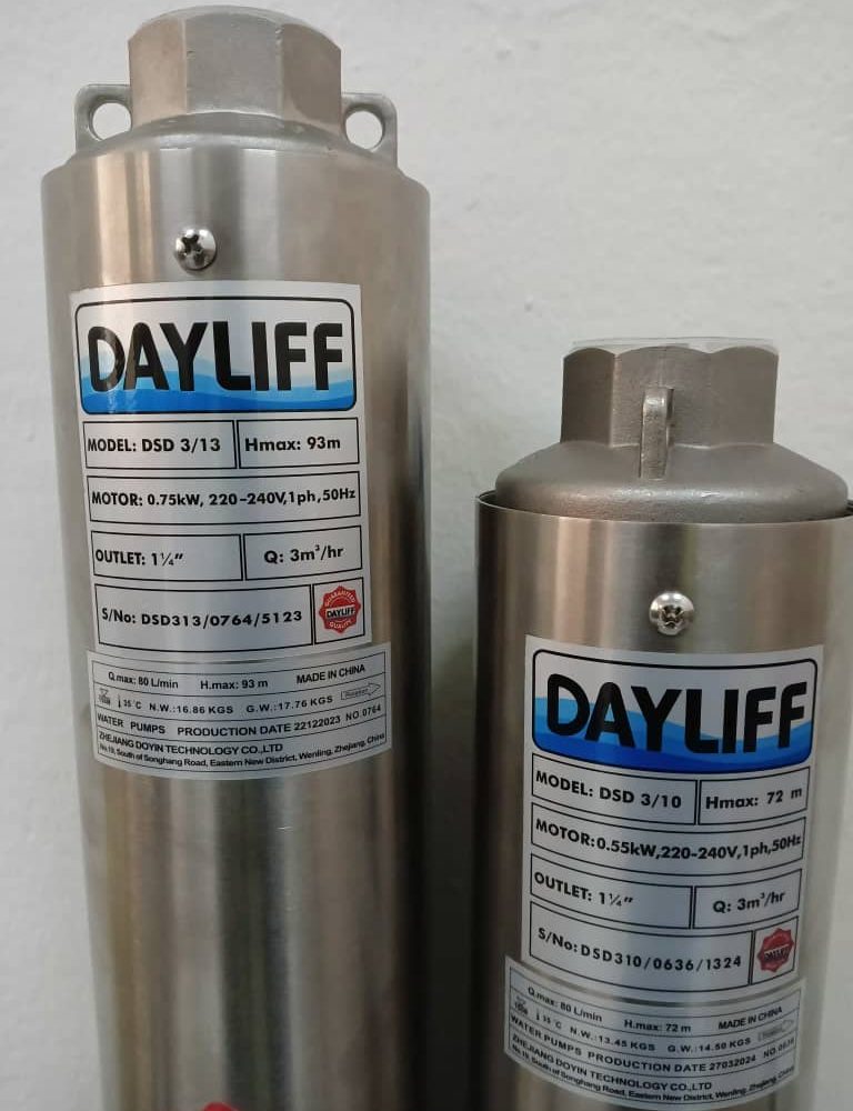 Comes with pump, 30m sub cable, control box, 100m poly pipe 32mm, cover plate, poly adapters & elbow, nylon rope, float switch, joint kit, rubber tape, insulation tape & surge protector.
